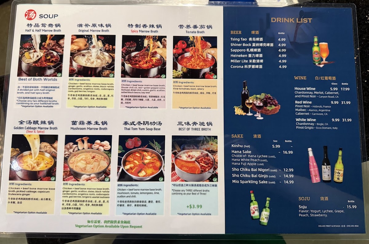 Ingredients chicken + beef bone marrow base broth, house chili oil, red + green peppercorns, sichuan dried chili, cumin, garlic, scallion, salted black beans, bay leaf